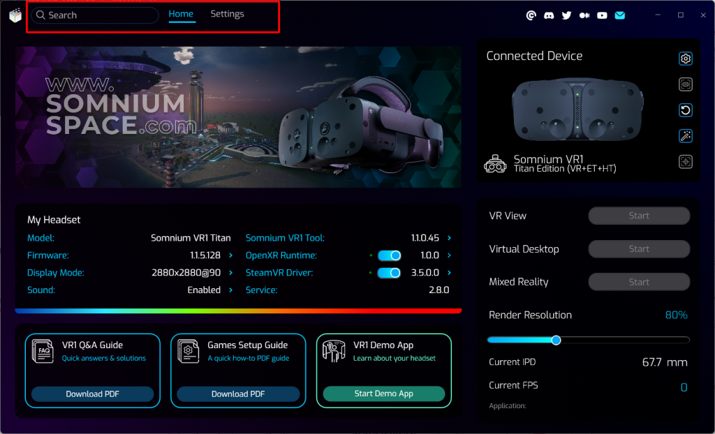 The rest of the Somnium VR1 Tool window will change depending on the specific page you are accessing, for example My Headset section on the Homepage, or detailed options on the Settings pages.