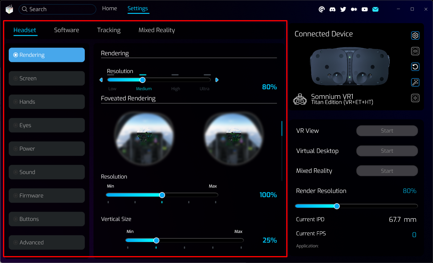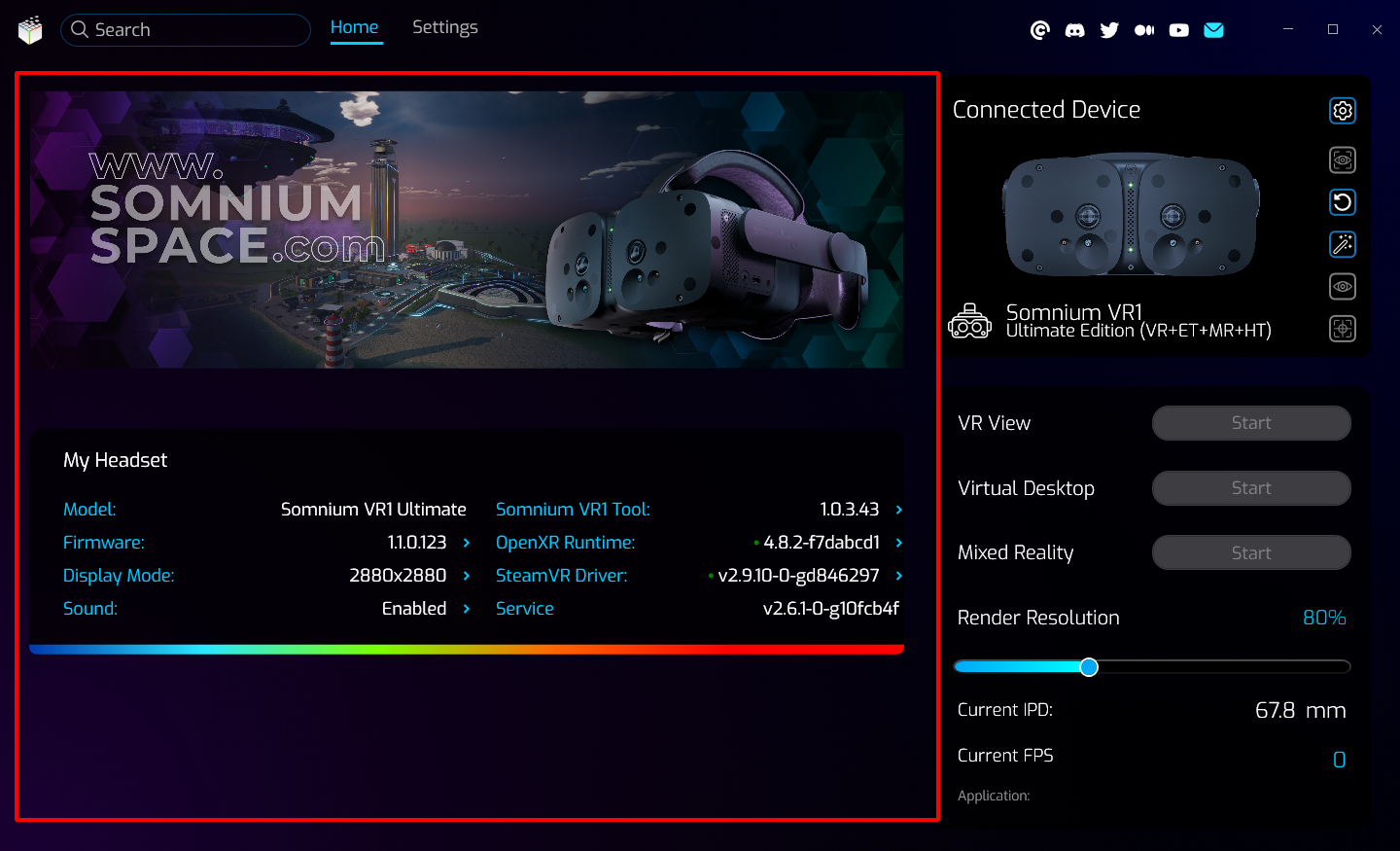 The rest of the Somnium VR1 Tool window will change depending on the specific page you are accessing, for example My Headset section on the Homepage, or detailed options on the Settings pages.