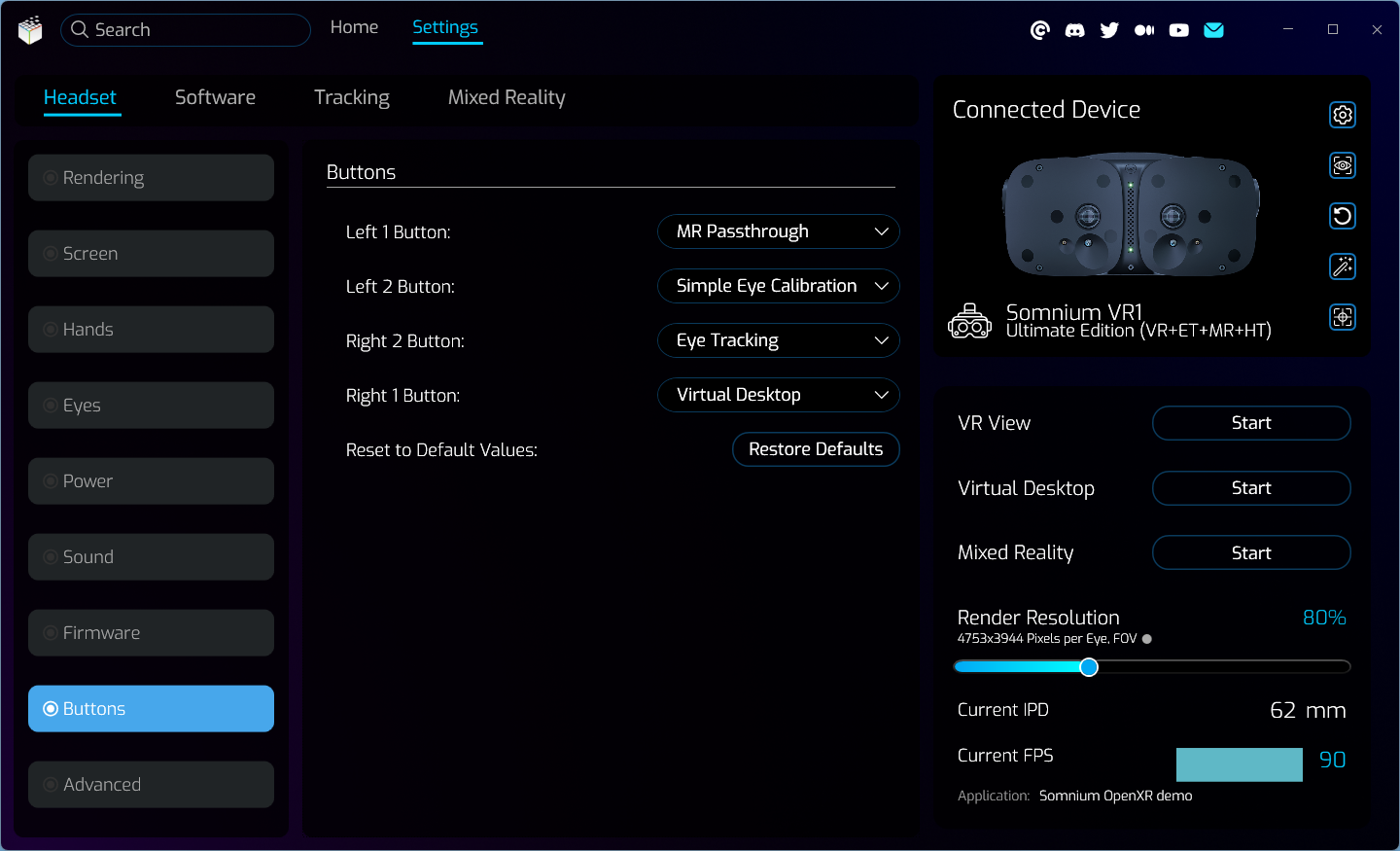 Buttons page allows customizing the functions of hardware buttons on top of the Somnium VR1 headset.