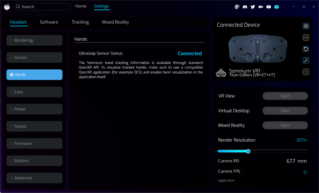 - To test hand tracking you can use the Somnium Demo App from Homepage.