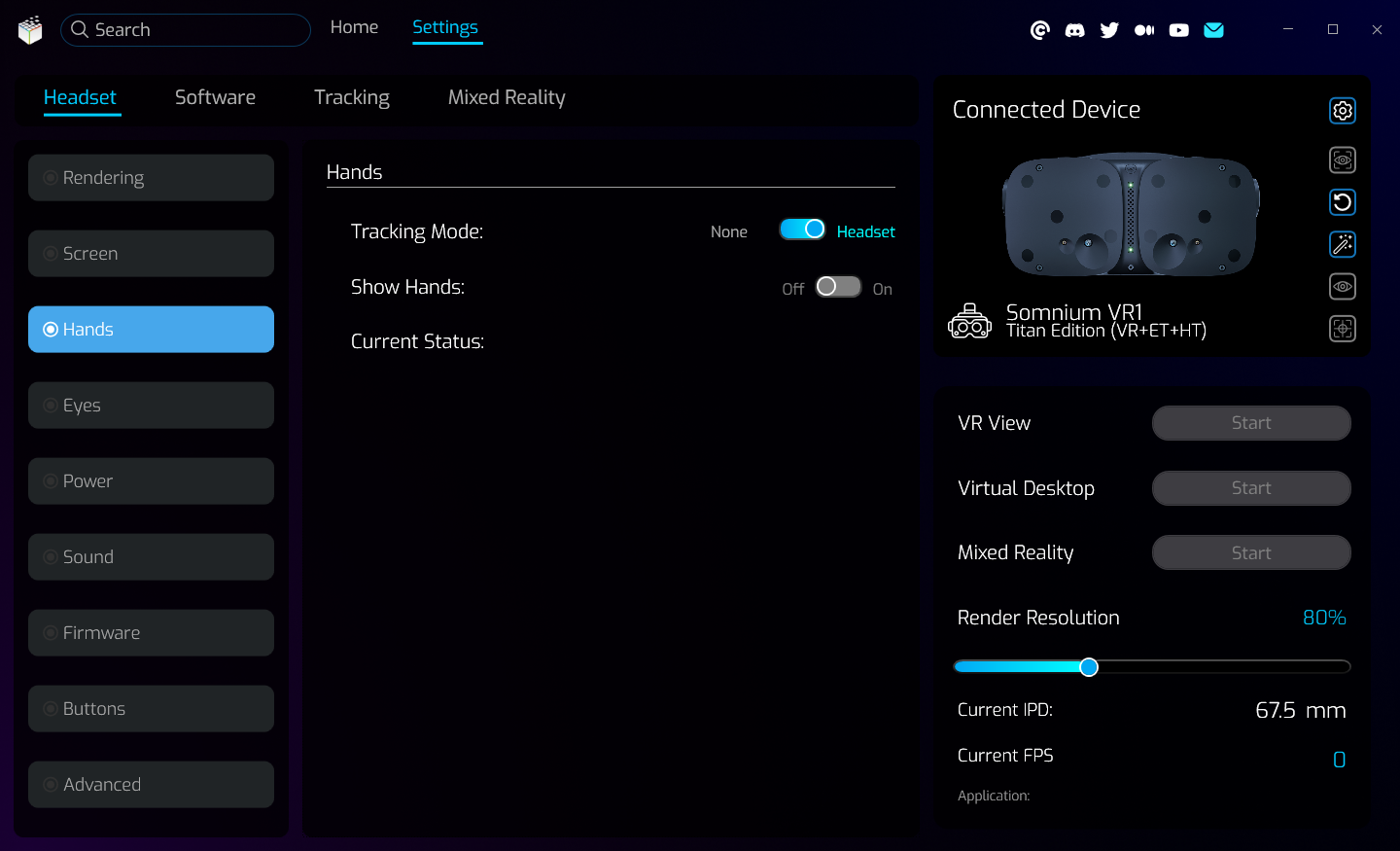 - To test hand tracking you can use the Somnium Demo App from Homepage.