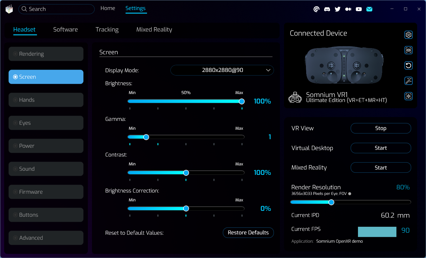 • Changes the hardware resolution and frequency of the displays inside the headset (be aware that this requires headset restart).