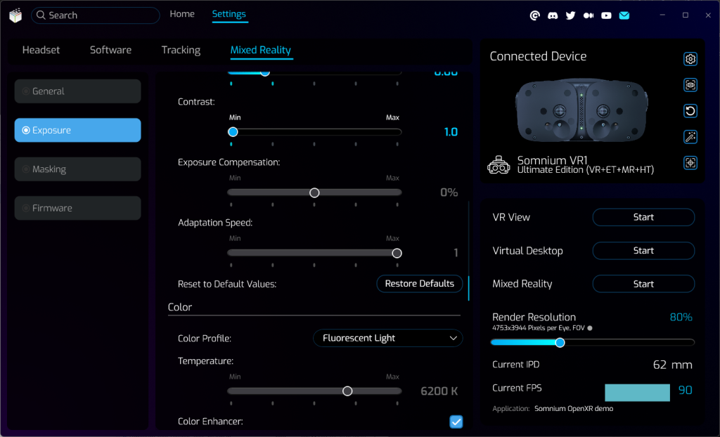 Exposure page contains mixed reality camera exposure and color options.