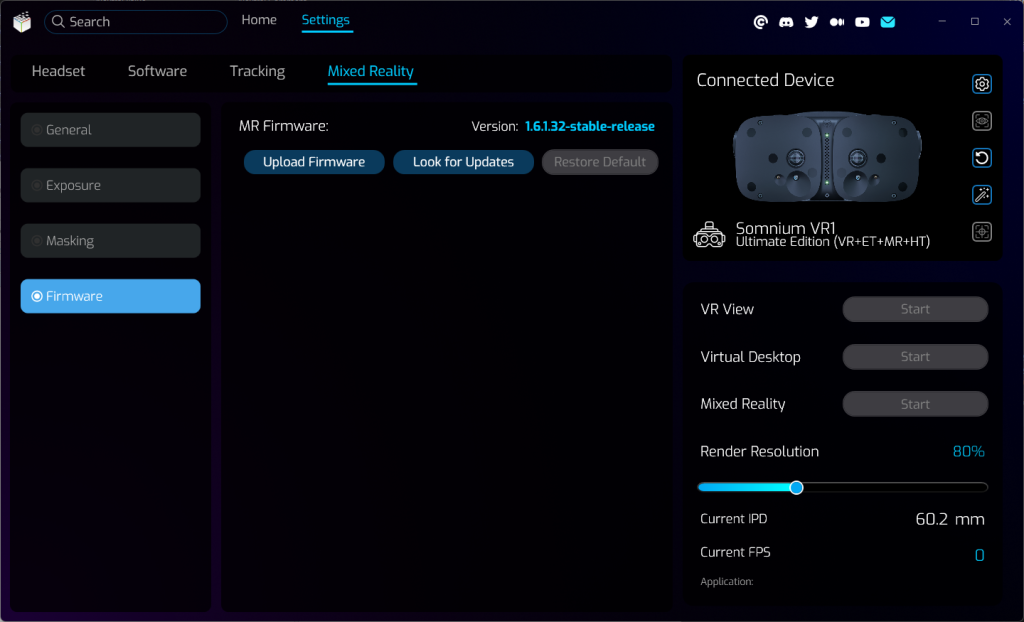 Firmware page shows information about the firmware installed in the connected mixed reality module, and allows updating it.