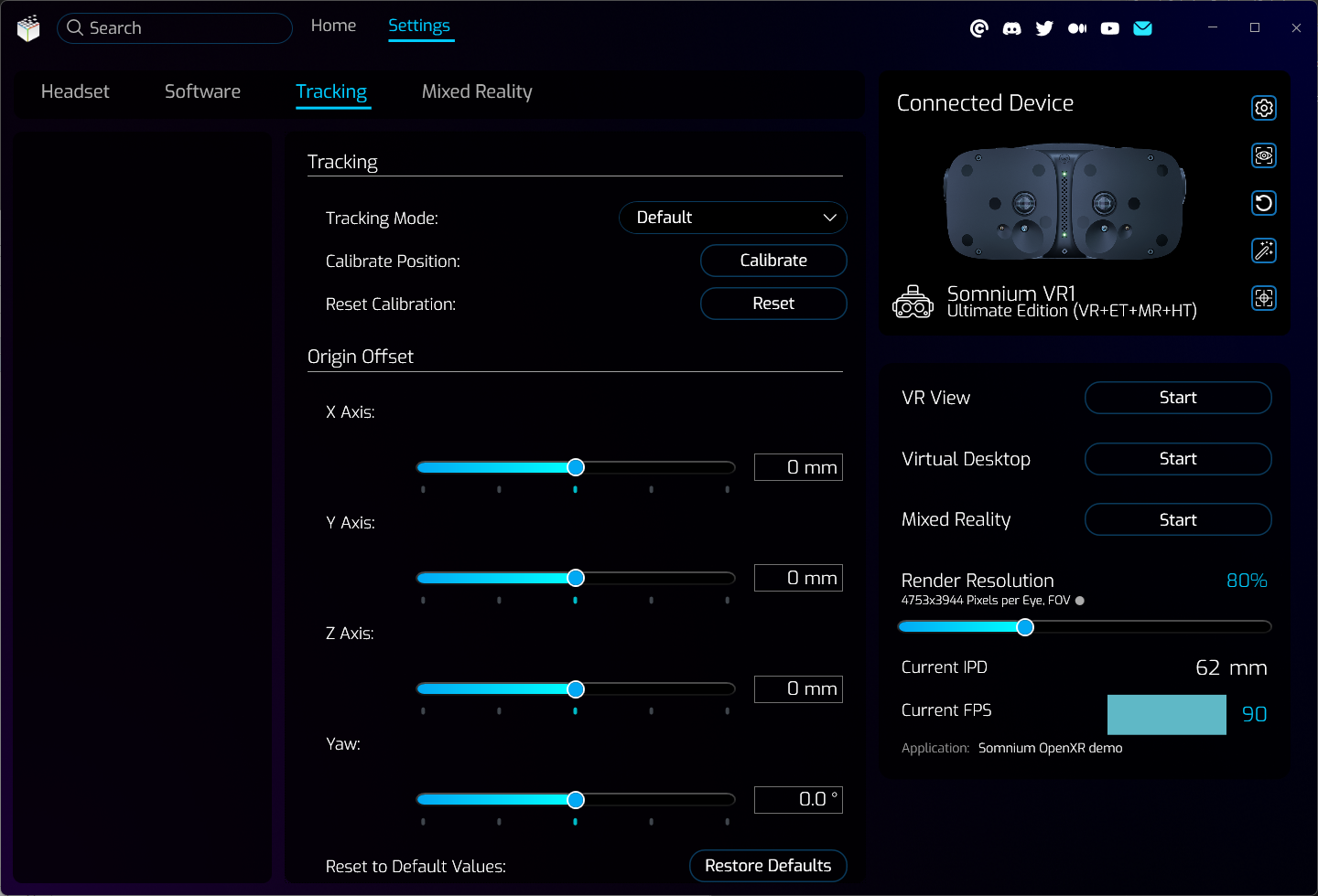 - Clicking the Calibrate button will save the current headset position as origin (0,0,0) for your VR space.